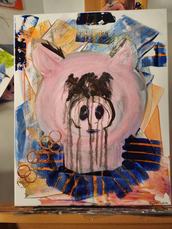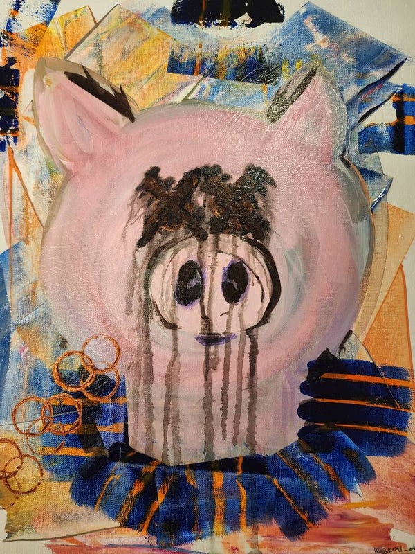 See no Evil is a striking acrylic painting that merges whimsical imagry and dark emotional undertones. Dominating the canvas is a stylized cartoonish pig's head in soft pinks and muted tones, yet the expression is anything but playful.